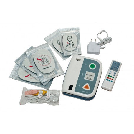 Najprostrzy w obsłudze treningowy defibrylator AED. Kompatybilny z każdym rodzajem fantomów do resuscytacji. Sprawdzony i niezawodny. Posiada dwa języki i opcję podłączenia elektrod pediatrycznych.